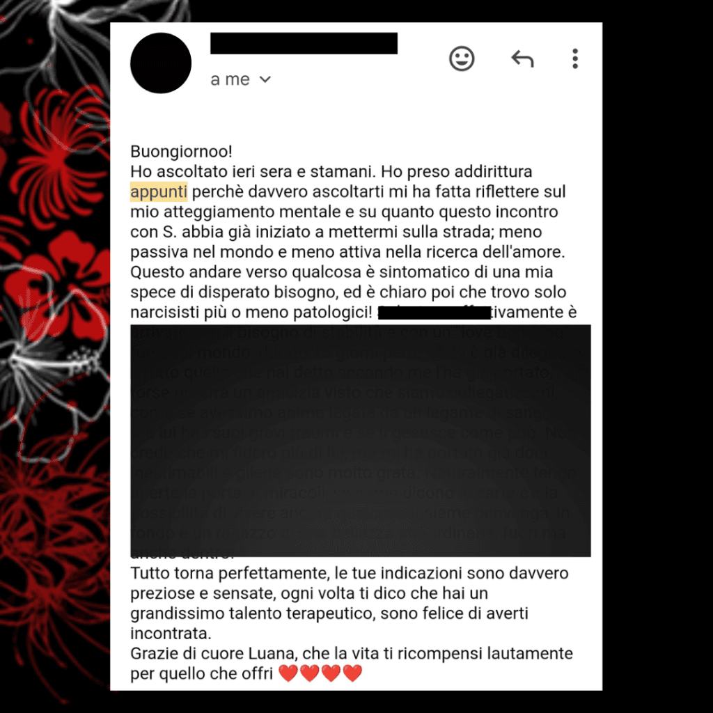 - Rivolgiti a me se vuoi la verità e sei pronto ad affrontarla. Sarò comprensiva e delicata nell’affrontare insieme a te le questioni più spinose, ma userò un linguaggio diretto e senza filtri dove necessario ed opportuno. Miro all’indipendenza della persona nelle sue scelte e nel suo percorso di vita, non al diventare la sua migliore amica falsa.
